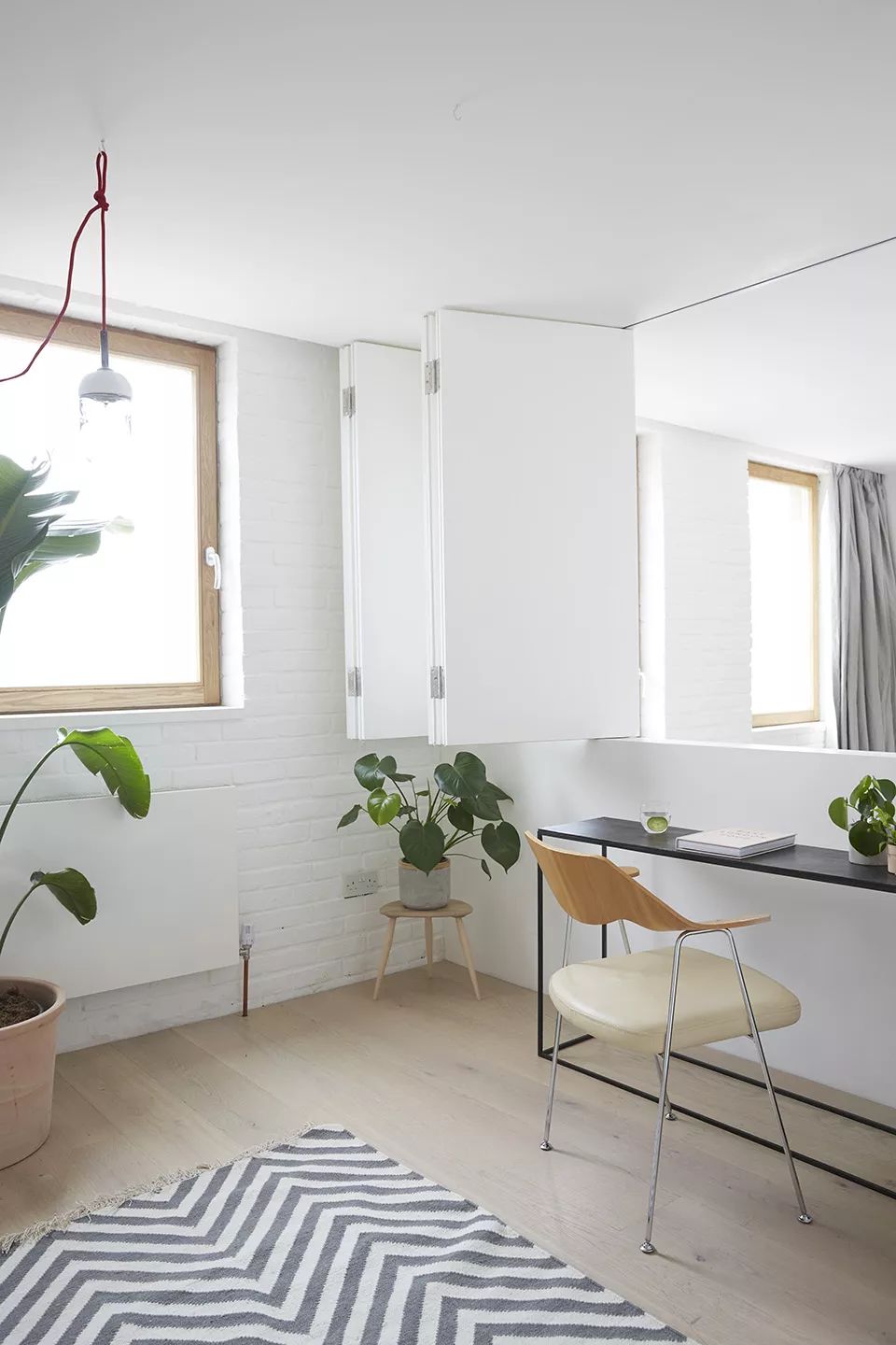 ▲ 沙发墙上部做了一道白色折叠窗,打通空间之余也给日常生活带来更多变的趣味。