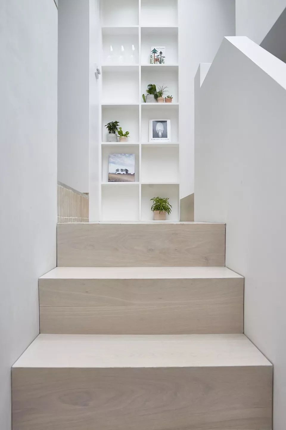 ▲ 楼梯分岔口做了壁龛的收纳用以展示小盆栽和书籍,配合自然光的衬托,狭窄的空间也有了更多的活力趣味。